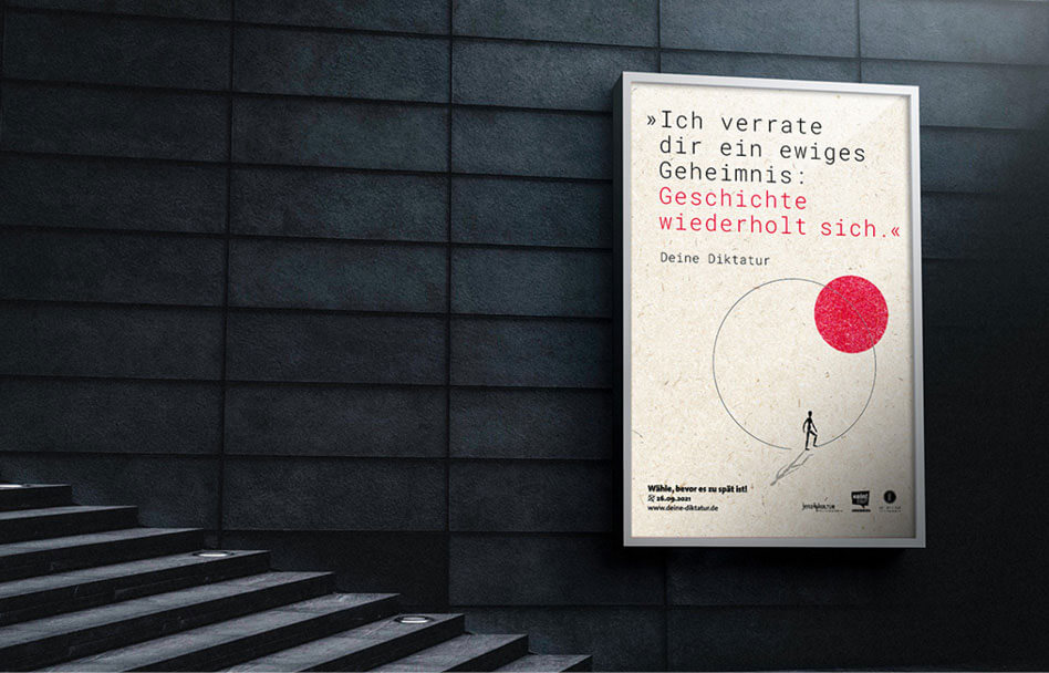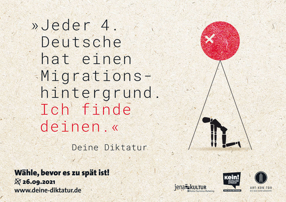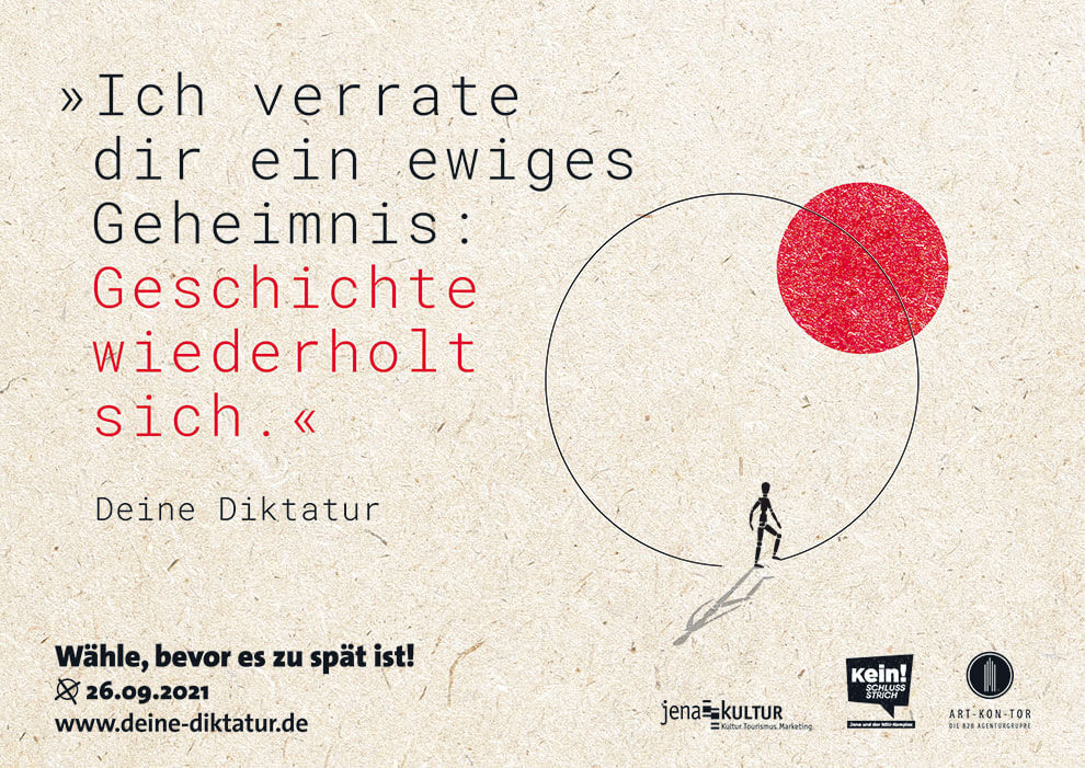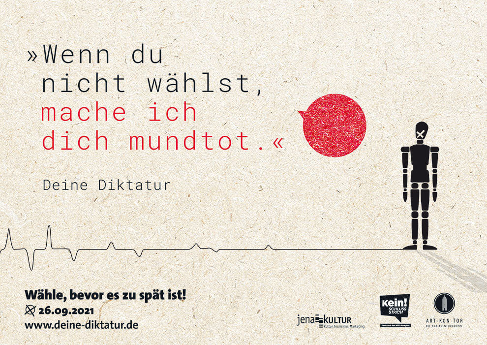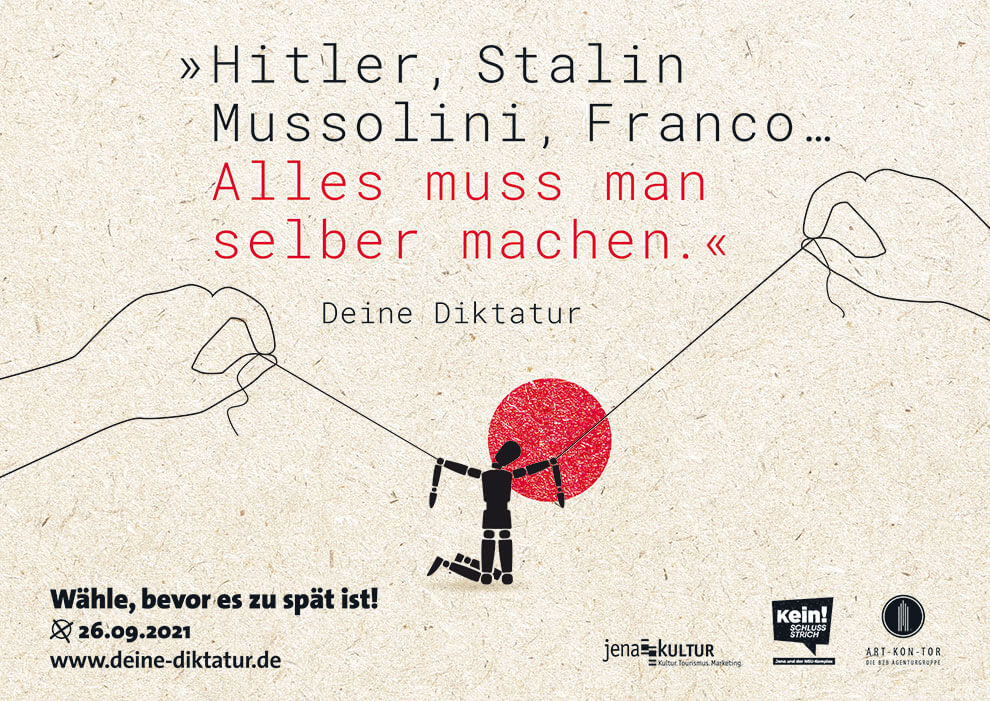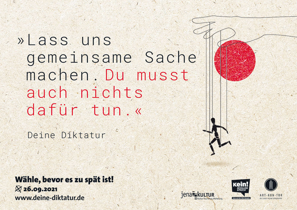 „Deine Diktatur“ war ursprünglich eine Idee für einen anderen Kunden. Die Schwierigkeit bestand darin, Kooperationspartner zu finden, die mit uns gemeinsam diese Kampagne auf die Straße bringen. Zum Glück haben wir sie noch gefunden: in Jena Kultur und Kein Schlussstrich! e.V.