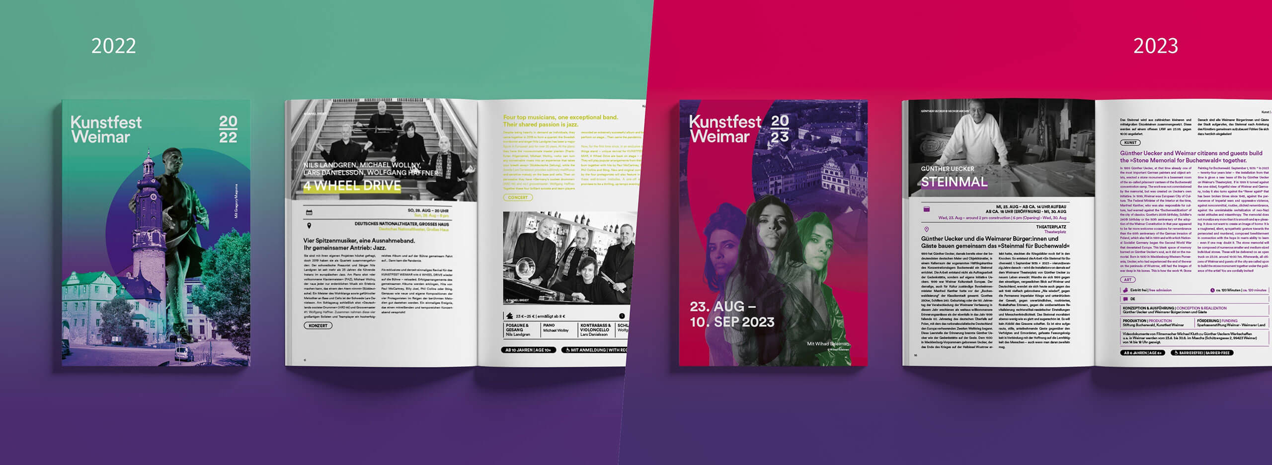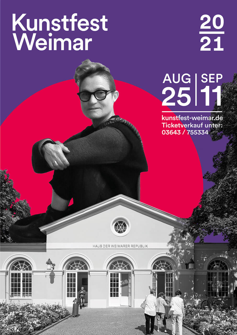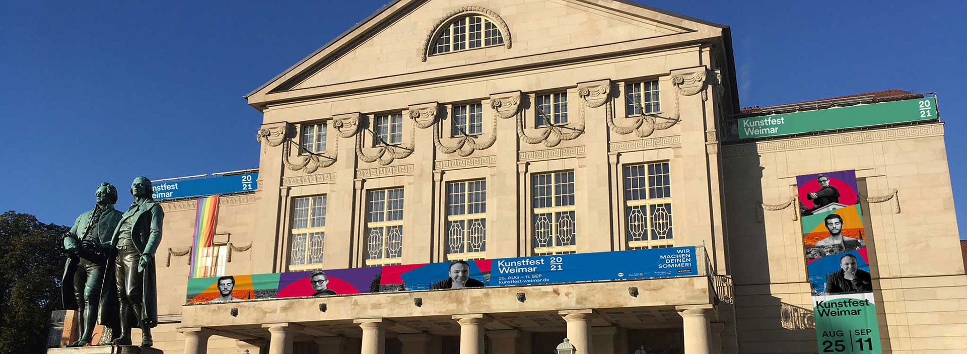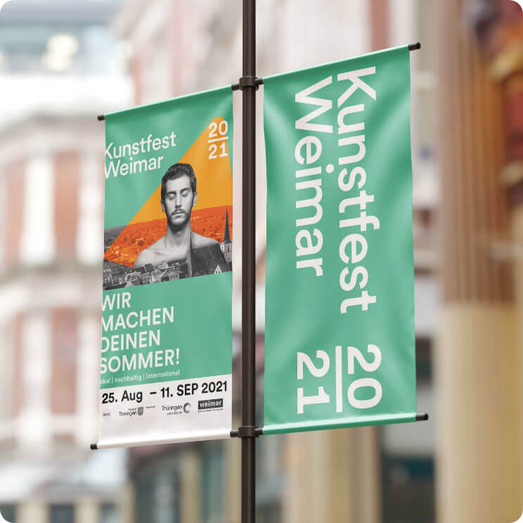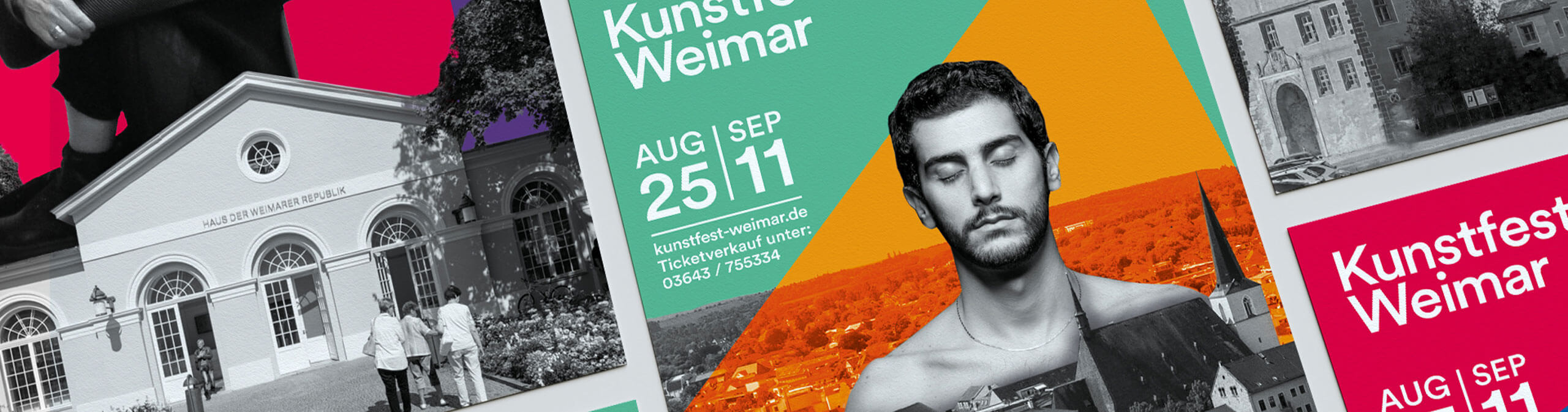 Um all die verschiedenen Kunstformen unter ein Dach zu bringen, war also ein gemeinsamer Look nötig. Einer, der aber nicht nur alles unter ein Dach bringt, sondern gleichzeitig auf die Stadt bzw. den Ort Weimar aufmerksam macht. Und einer, der in Zeiten der Corona-Pandemie auch ein bisschen die Schwere von den Schultern nimmt.